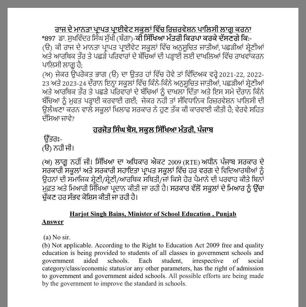 Comment on RTE by Punjab Education Minister |